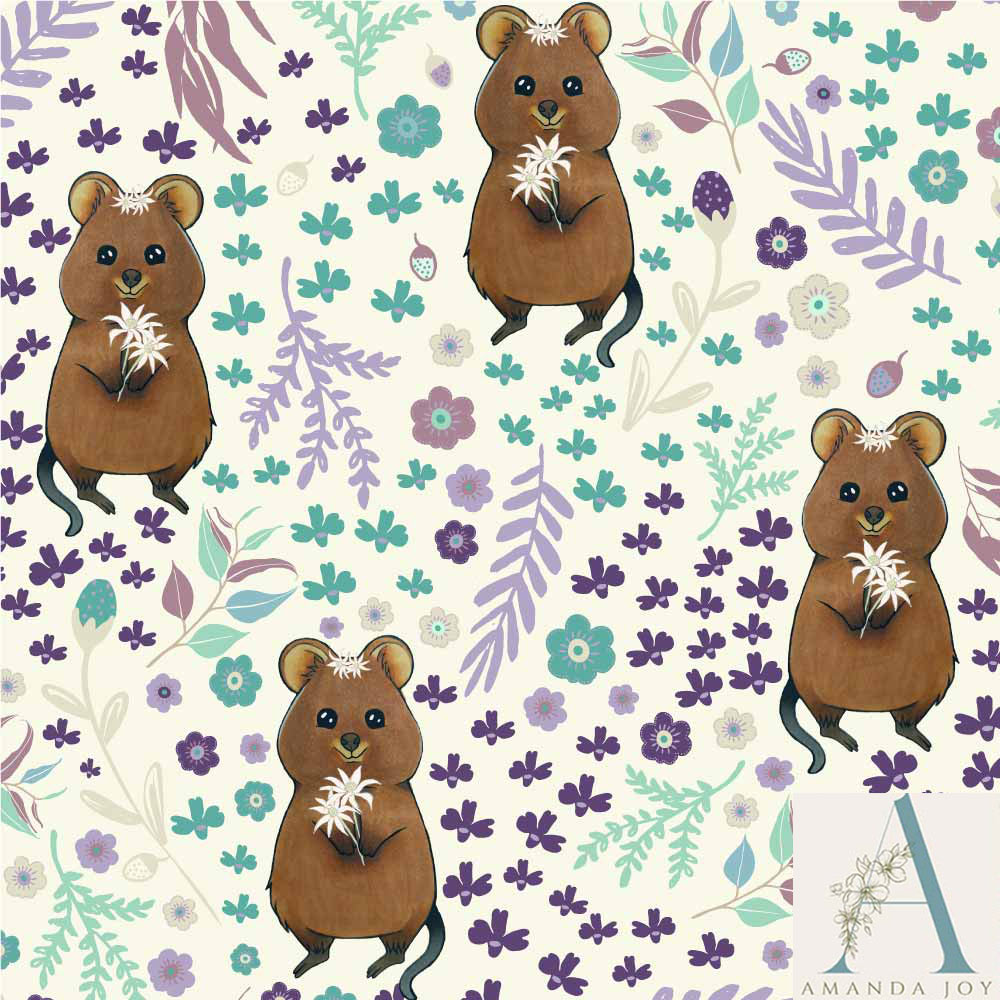 This quokka Australian made fabric features a beautiful hand painted quokka by Australian designer Amanda Joy. These sweet little quokka's are set in a garden scene, holding flannel flowers. Adorable!